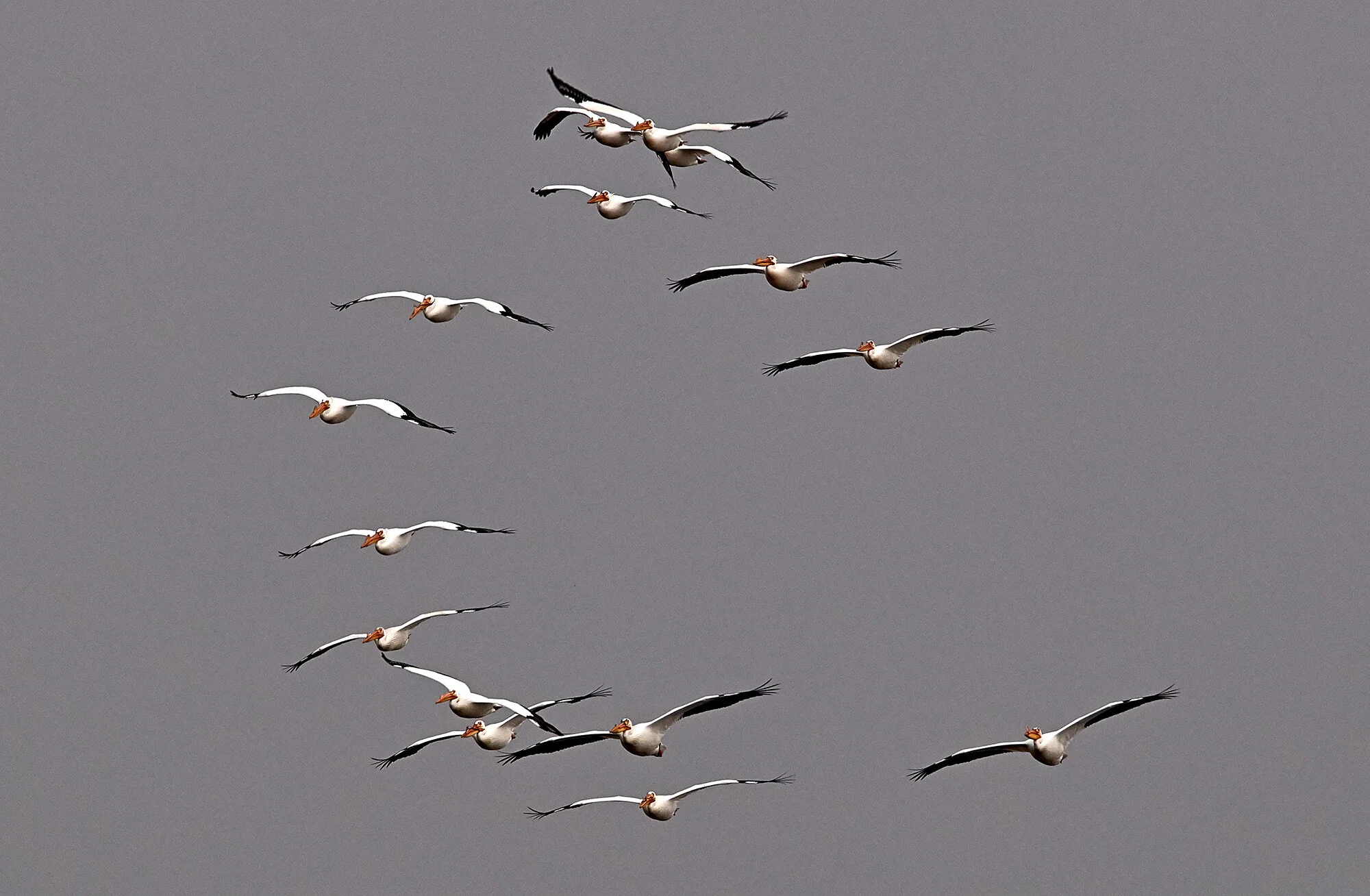 white pelican flying with wings up