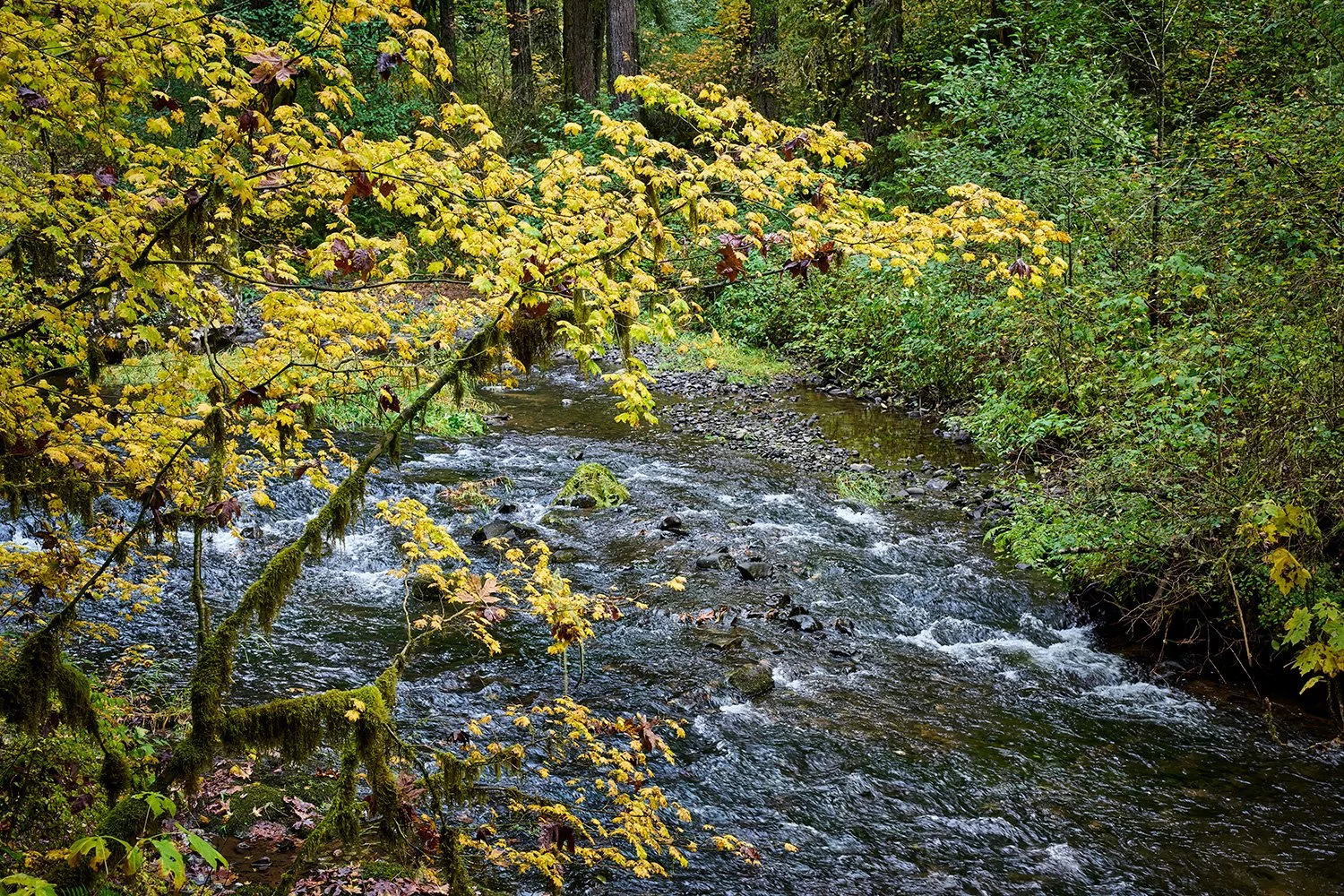 With the dry end of summer and sudden onset of rains, the progression of autumn colors has been a bit unusual this year, and yet the magic of a walk in Silver Falls State Park is still evident. As these photos show, many of the Bigleaf Maple leaves turned brown and fell, but others are now bright yellow, and the vine maples, though mottled with brown, still create beautiful illumination effects in the forest.