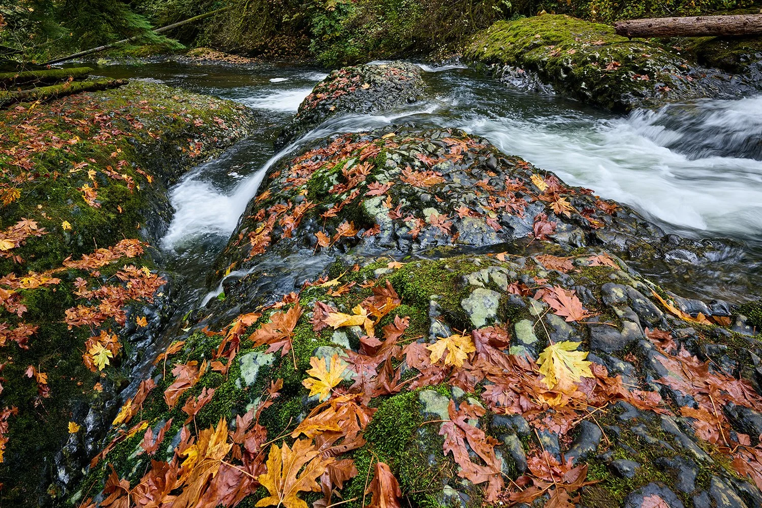 Colorful rock formations in stream at Silver Falls State Park, Oregon