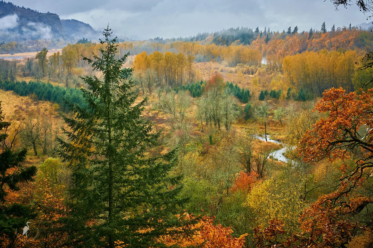 The autumn color was especially beautiful this past fall. Here is an example of that beauty photographed from the bridge at Shepherd’s Dell looking northwest down the gorge. The Vista House is visible in the upper left of the image, and the river is just peeking through the vegetation in the upper right-center of the image. The stream in the middle is the stream that flows through Shepherd’s Dell. The day was blustery and misty, accounting for the soft light and clear colors.